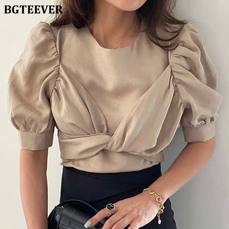 Модные однотонные свободные женские блузки BGTEEVER с круглым вырезом и коротким рукавом с буфами, женские рубашки на шнуровке, лето 2021, элегант...