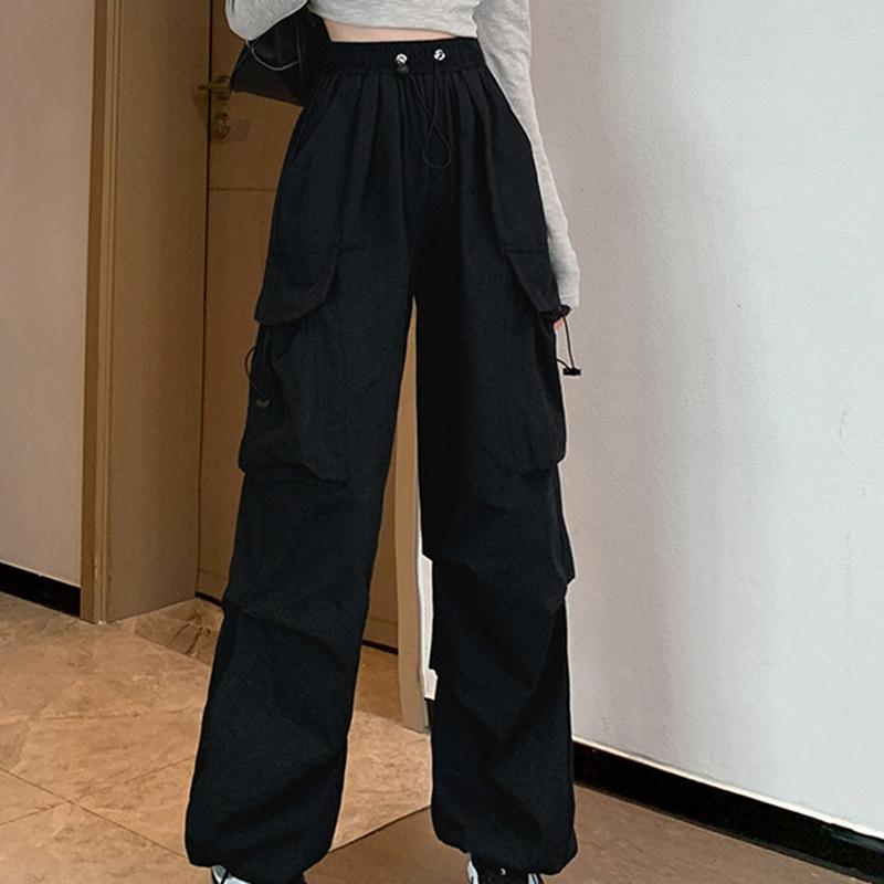 Модные повседневные свободные широкие брюки женские уличные брюки с высокой талией свободные длинные брюки-карго женские винтажные карманы однотонные женские брюки для бега новые 27493 XXL чёрный