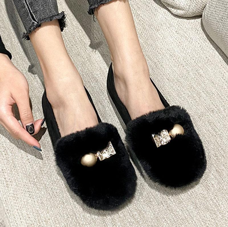 Модные роскошные туфли на плоской подошве из кроличьего меха женские плюшевые мокасины с металлическим шариком из хрусталя зимние хлопковые туфли женские мокасины из флиса большие размеры 40-43 8.5 чёрный