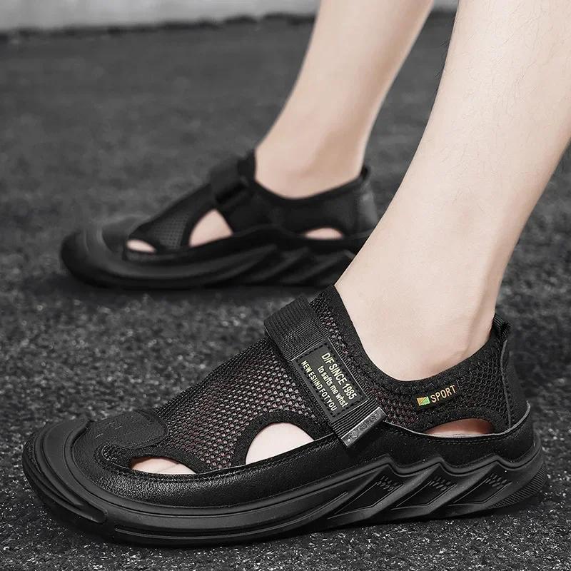 Модные сетчатые туфли для мужчин, новые летние новые дышащие сандалии Baotou для спорта на открытом воздухе и отдыха на мягкой подошве с противоскользящей подошвой 45 чёрный