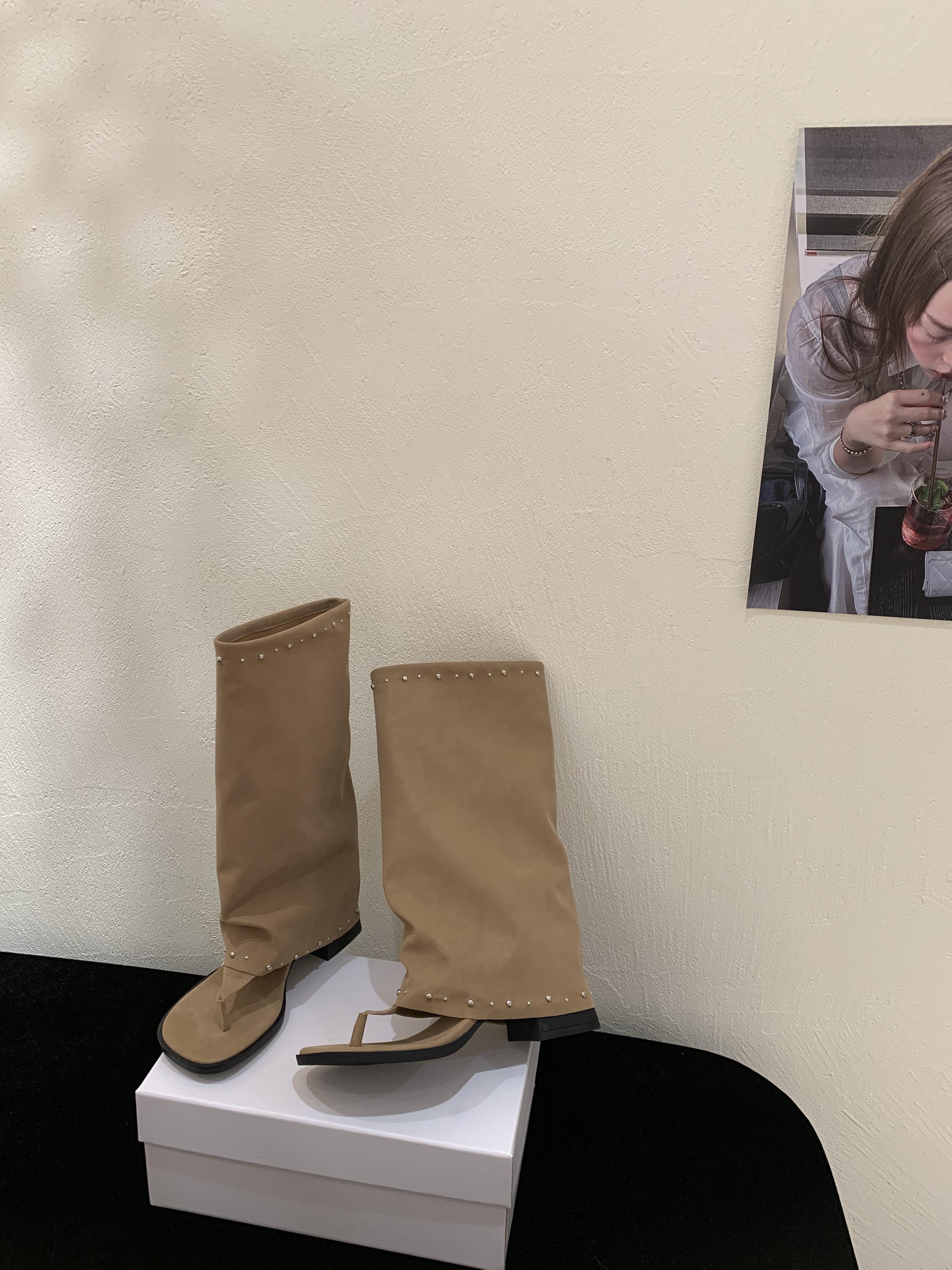 Модные черно-коричневые ботильоны с перемычкой для пальца, заклепками, в стиле бохо, ретро, из замши, плиссированные ботфорты, летние туфли на высоком каблуке, женские туфли-лодочки 39 бежевый
