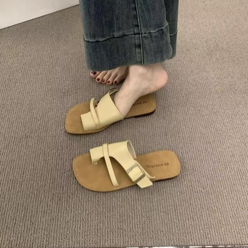Модные шлепанцы Новые летние корейские коричневые шлепанцы с отведением пальцев Плоская обувь Винтажные простые кожаные женские для ходьбы на улице Пляжные сандалии 40 жёлтый
