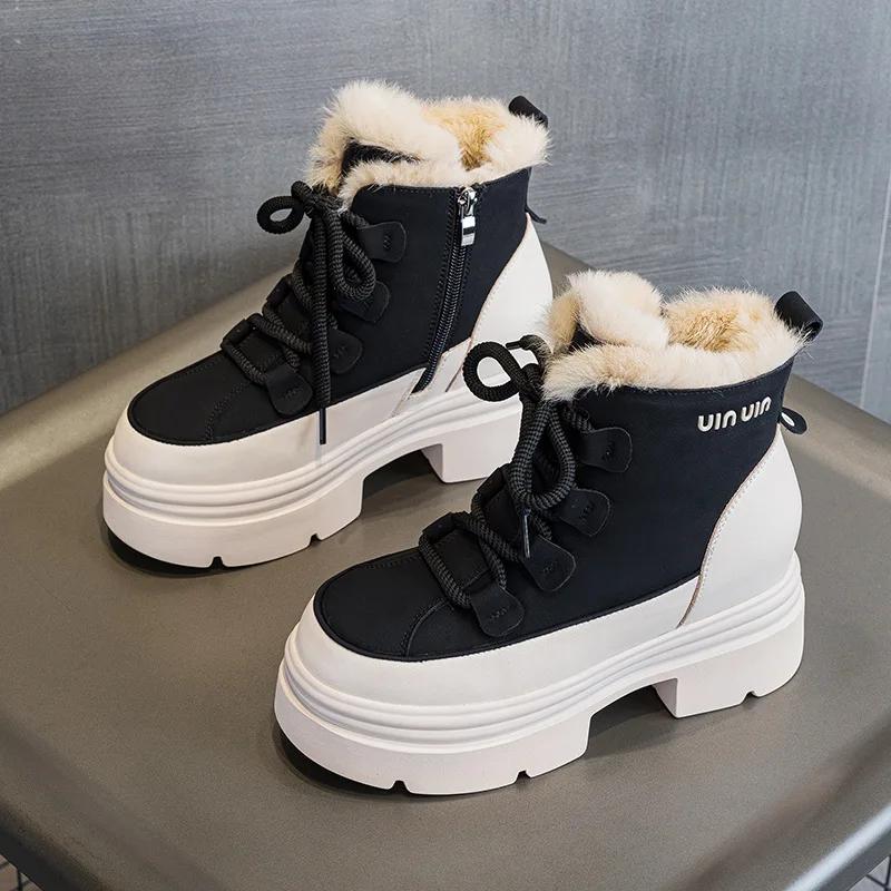 Модные 7 см Коровья замша Натуральная кожа Труба Женские Модные Ботильоны Ботинки Мокасины Дамская Зимняя Плюшевая Весенне-Осенняя Обувь 34 чёрный