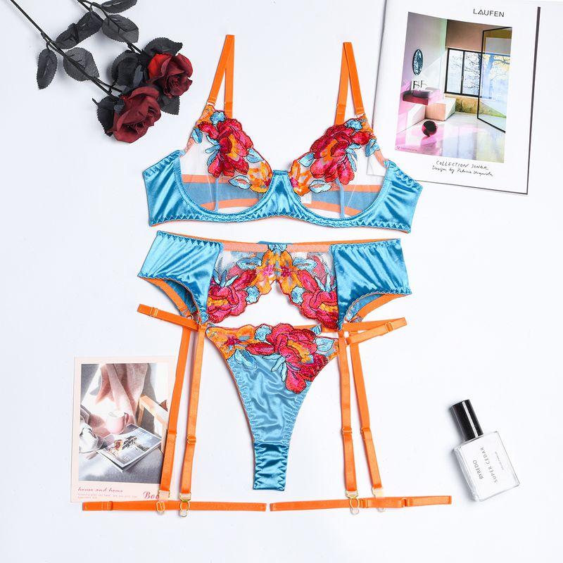 Модный Ретро Летний Сет из Трех Предметов Сетчатый Прозрачный Вышивка Цветы Пэчворк Тяжелая Промышленность Контрастный Цвет Ажурный Топ на Бретелях Женский Lake Blue L