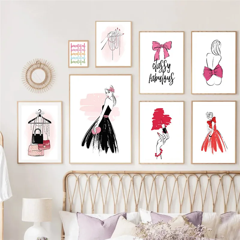 Модный плакат красивая леди бант Холст Картина помада сумка для обуви настенное искусство Девушка Спальня украшение домашний Декор картин...