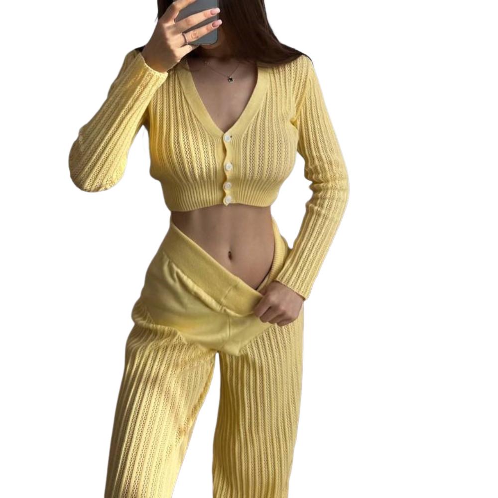 Модный и роскошный женский вязаный сексуальный полый топ и брюки, комплект из двух предметов. L жёлтый