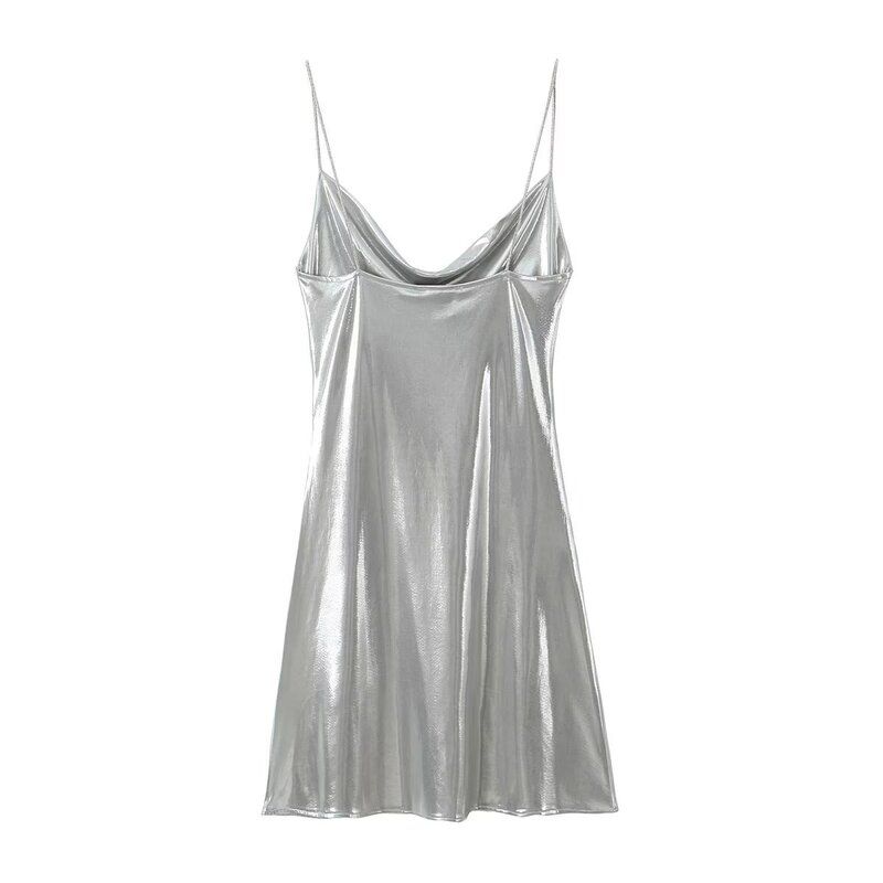 Модный стиль 2023 Осень Новое Женское Облегающее Легко Сочетаемое Платье Мини на Бретелях с Металлическим Декором Короткая Юбка 1165152 Silver XS