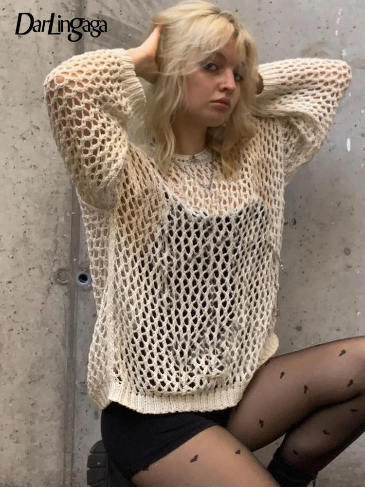 Модный шикарный пляжный праздничный вязаный крючком свитер Darlingaga, повседневный свободный ажурный праздничный наряд, пуловер, трикотажная ...