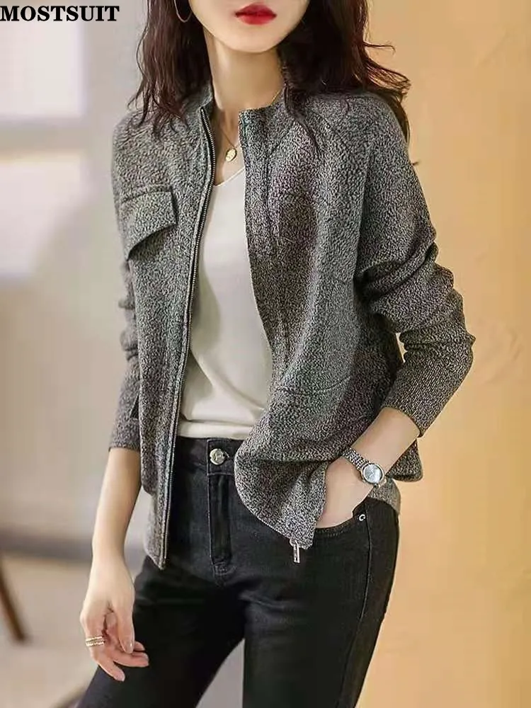 Серый вязаный кардиган на молнии, женский свитер, пальто, тонкие Топы с длинным рукавом и воротником-стойкой, Повседневная модная трикотажн...