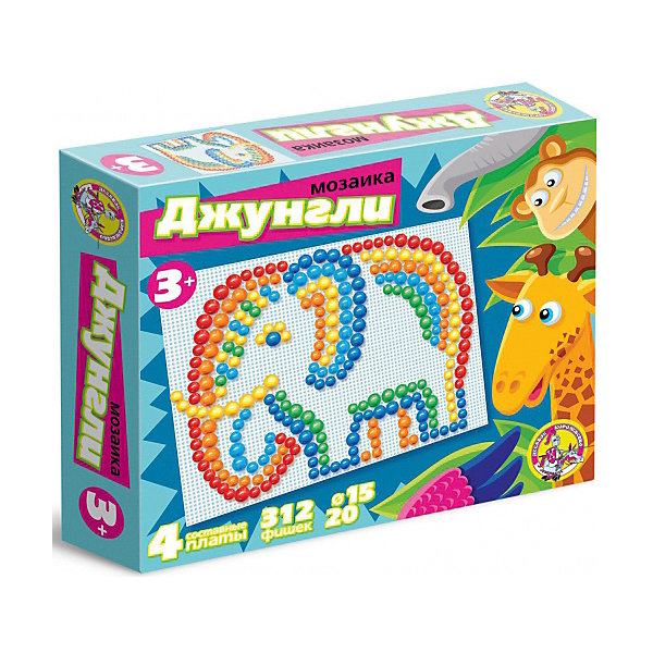 Мозаика Джунгли d15, d20/6 цв/312 эл/4 поля изготовлена из качественных материалов. В составе круглое игровое поле с отверстиями, 390 элементов выполнены в форме шестигранников на ножке, в комплект входит инструкция со схемой сборки картинок. Можно составлять картинки по инструкции или придумывать собственные варианты, а также изучать основные цвета.