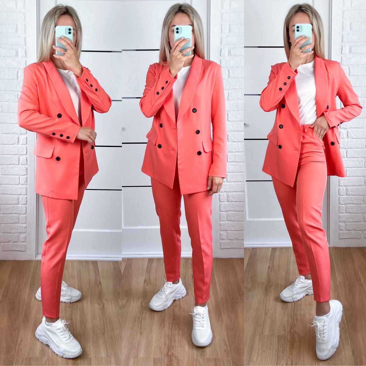 Классический, молодежный брючный костюм женский из костюмной ткани. Пиджак - прямой, свободный, двубортный, с длинными рукавами и большими пуговицами. Без подкладки, карманы не рабочие. Брюки - зауженные к низу, с притачным поясом, ширинкой и карманами. Цвет: красный, чёрный, джинс, охра, горчица, лосось, пудра, морская волна, капучино, белый, небесный, тифани, малина, лимон, лаванда, трава, миндаль, мята.
