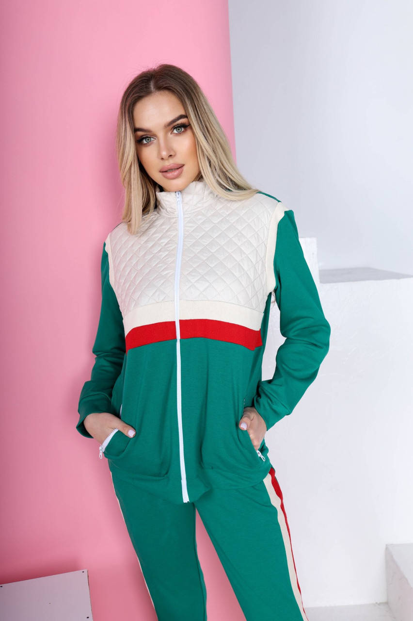 Модный женский костюм из качественной турецкой двухнитки, декоративные вставки из хлопковой вязки. Свободная удлиненная кофта с круглой горловиной-стойкой и центральной застежкой на молнию. Средней посадки зауженные брюки с боковыми карманами. Красивый и универсальный костюм на любой случай.