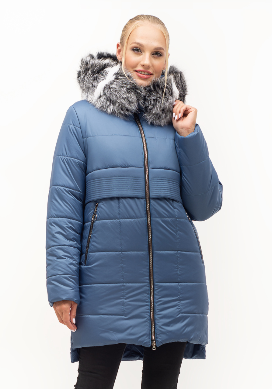 В качестве повседневной верхней одежды на холодный период года стоит купить красивый пуховик с натуральным мехом. Он выполнен в цвете джинс, подходит для любого цветотипа внешности и подчеркивает женственные линии фигуры.