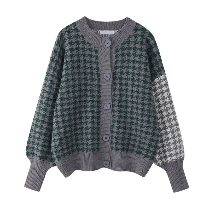 Зеленый зимний женский вязаный кардиган с рисунком «гусиные лапки», свитера, однобортные теплые свободные повседневные винтажные женские ...