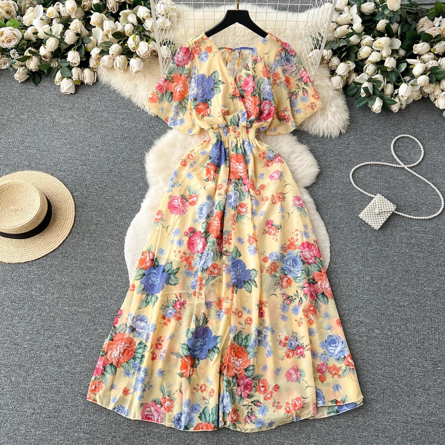 Морское праздничное шифоновое платье с принтом, женское летнее новое обтягивающее талии с v-образным вырезом средней длины, большая распашная юбка, модная One Size жёлтый