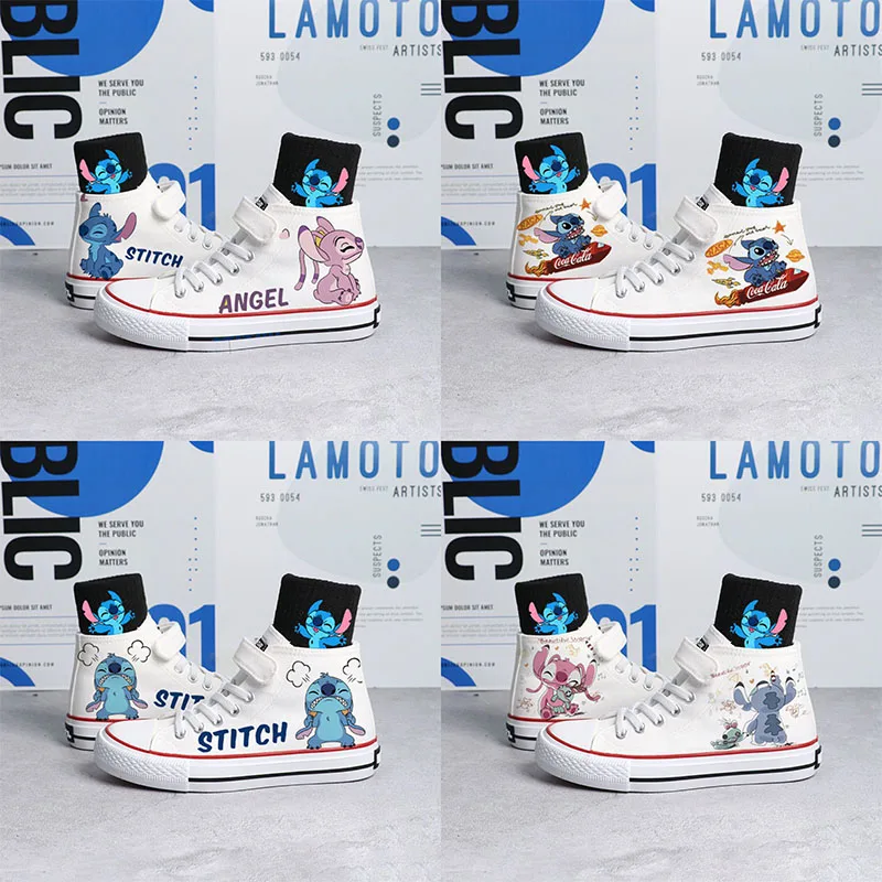Кавайная Милая парусиновая обувь с ангелом Ститч, детская обувь, повседневная Белая обувь с высоким верхом, мягкая подошва, ручной рисунок, подарок для детей