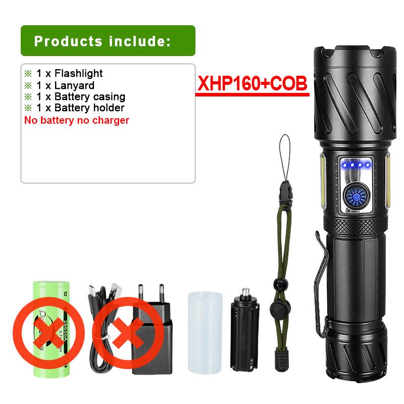 Мощный фонарик Супер яркий XHP160 LED + COB магнитная лампа Водонепроницаемая вспышка Перезаряжаемый фонарик A-Flashlight
