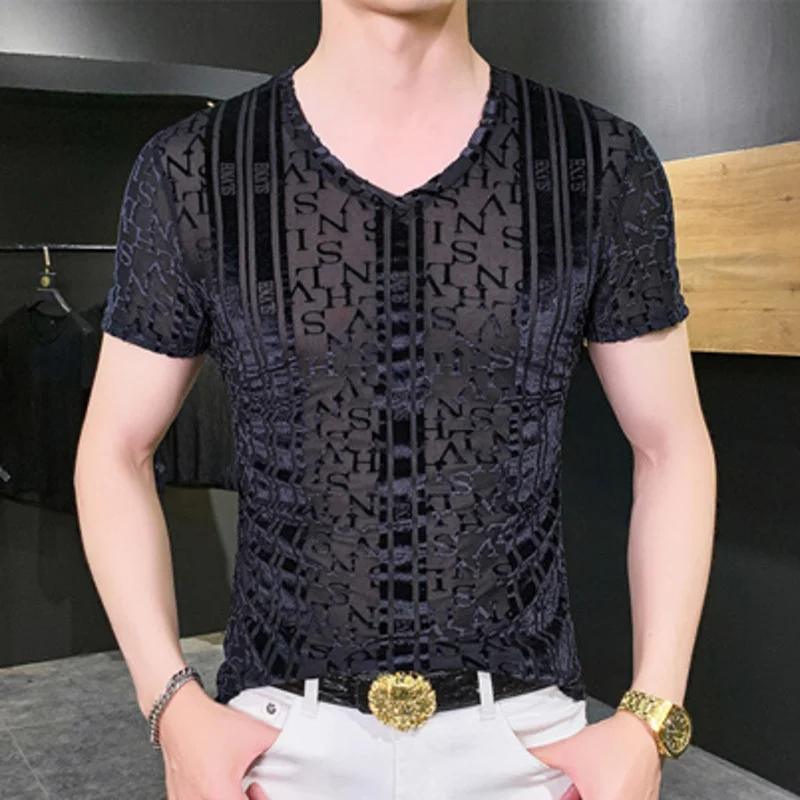 Мужская бархатная жаккардовая футболка с V-образным вырезом и коротким рукавом