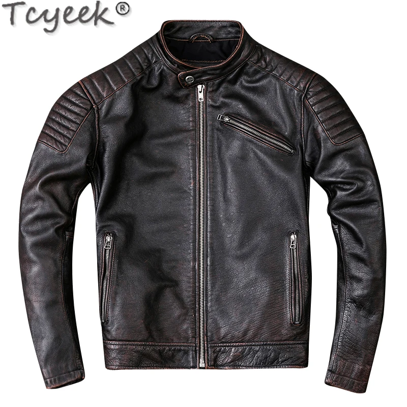 Мужская винтажная куртка из натуральной воловьей кожи, с воротником-стойкой