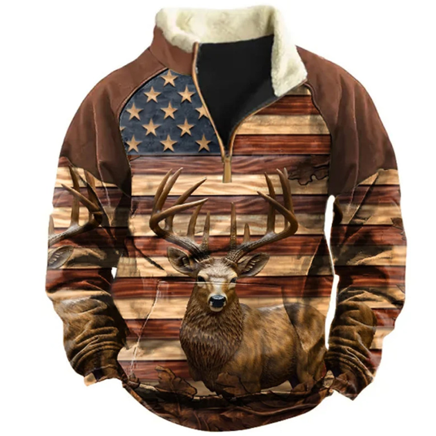 Мужская винтажная повседневная толстовка с флисовым лацканом на молнии и американским флагом в стиле вестерн с принтом лося