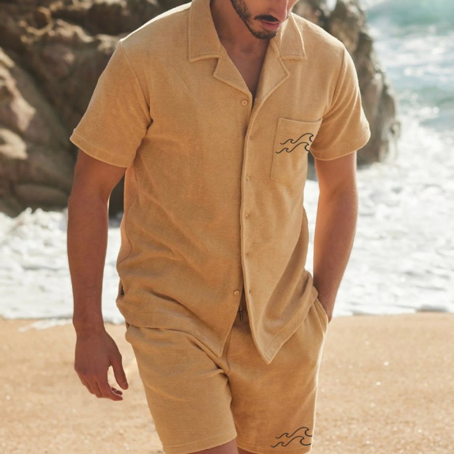 Мужская винтажная рубашка из французской махровой ткани с волнистой вышивкой повседневные топы в гавайском стиле для отдыха