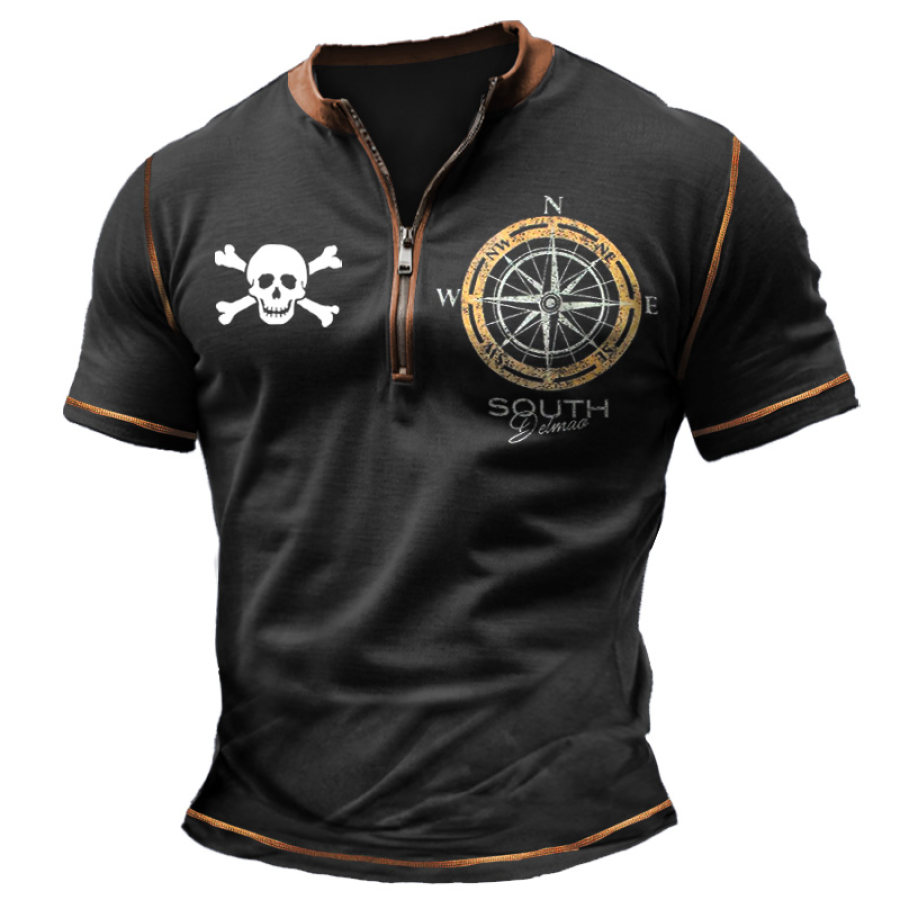 t-shirts,мужская винтажная футболка с воротником-хенли и застежкой-молнией с цветными блоками и морским компасом