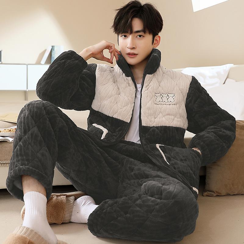 Мужская домашняя одежда, трехслойная зимняя домашняя одежда, мужская пижама, комплект пижамы из кораллового бархата, плотная плюшевая фланель, домашняя одежда на молнии XL for 60-70kg