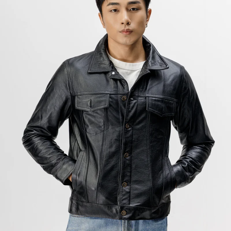 Мужская короткая мотоциклетная кожаная тонкая куртка из натуральной воловьей кожи