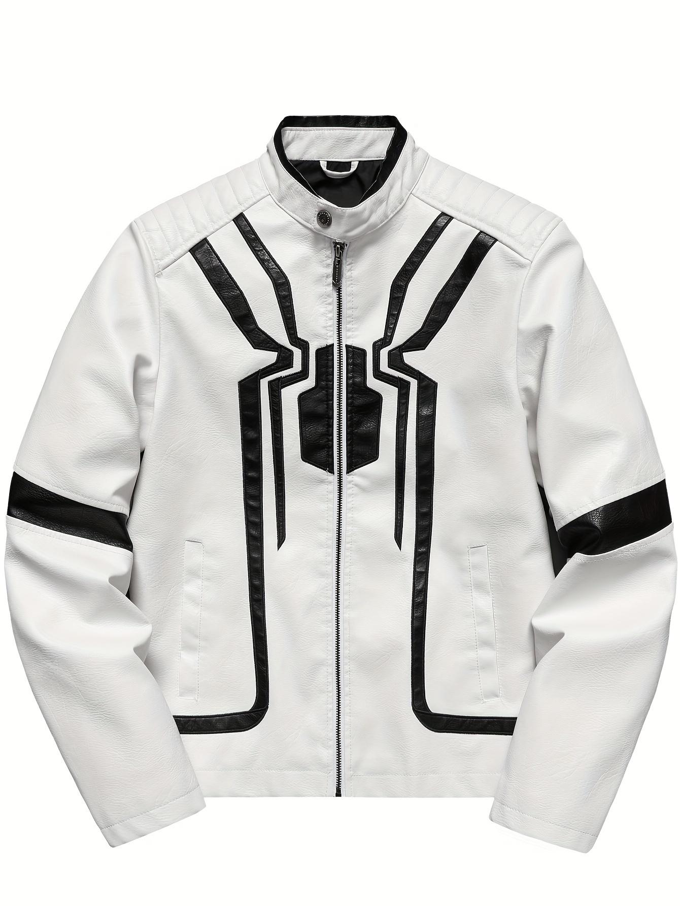 Мужская куртка в уличном стиле с цветными блоками и узором «паук» — мотоциклетное пальто из искусственной кожи PU, воротник-стойка, молния по всей длине — смесь полиэстера, неэластичная XXXL белый