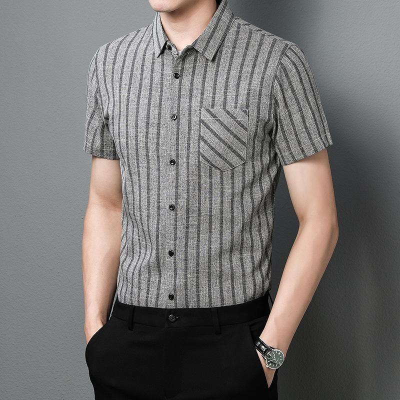 Мужская летняя полосатая серая хлопковая повседневная рубашка в полоску с коротким рукавом, тонкая летняя рубашка в полоску для молодежи XXXXL