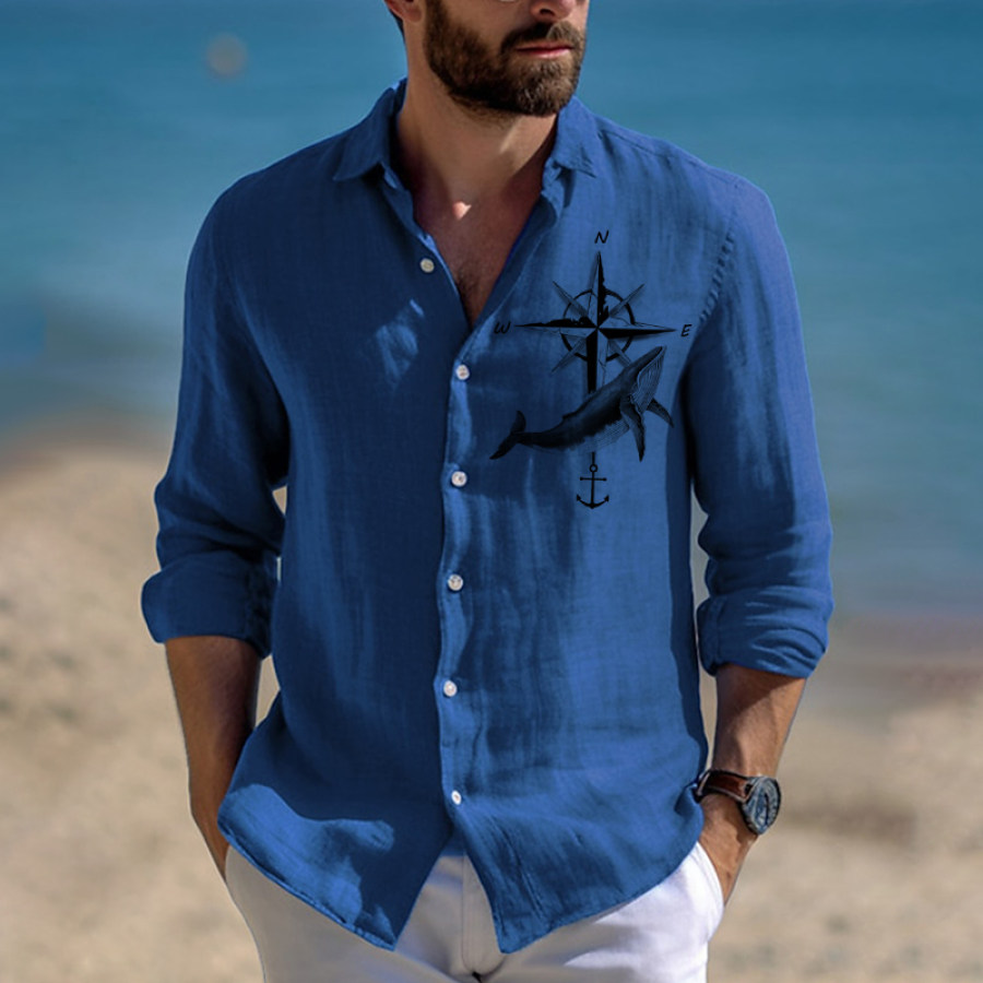 t-shirts,мужская льняная рубашка с длинными рукавами и пуговицами с принтом морского компаса