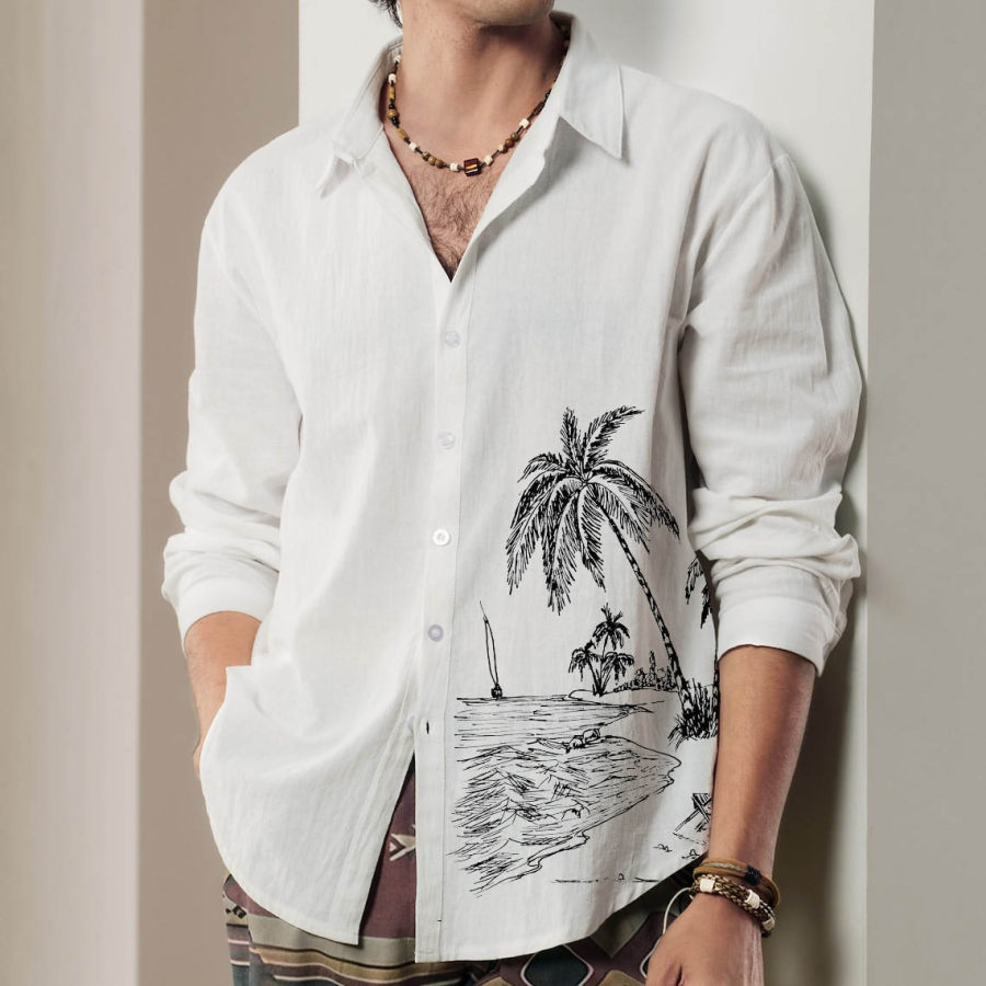 Мужская повседневная льняная рубашка с принтом кокосовой пальмы для пляжного отдыха и длинным рукавом