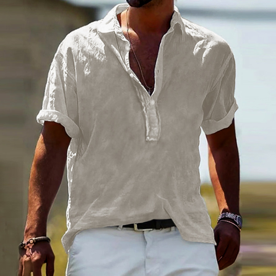 t-shirts,мужская повседневная однотонная хлопковая льняная рубашка с полуоткрытым воротником
