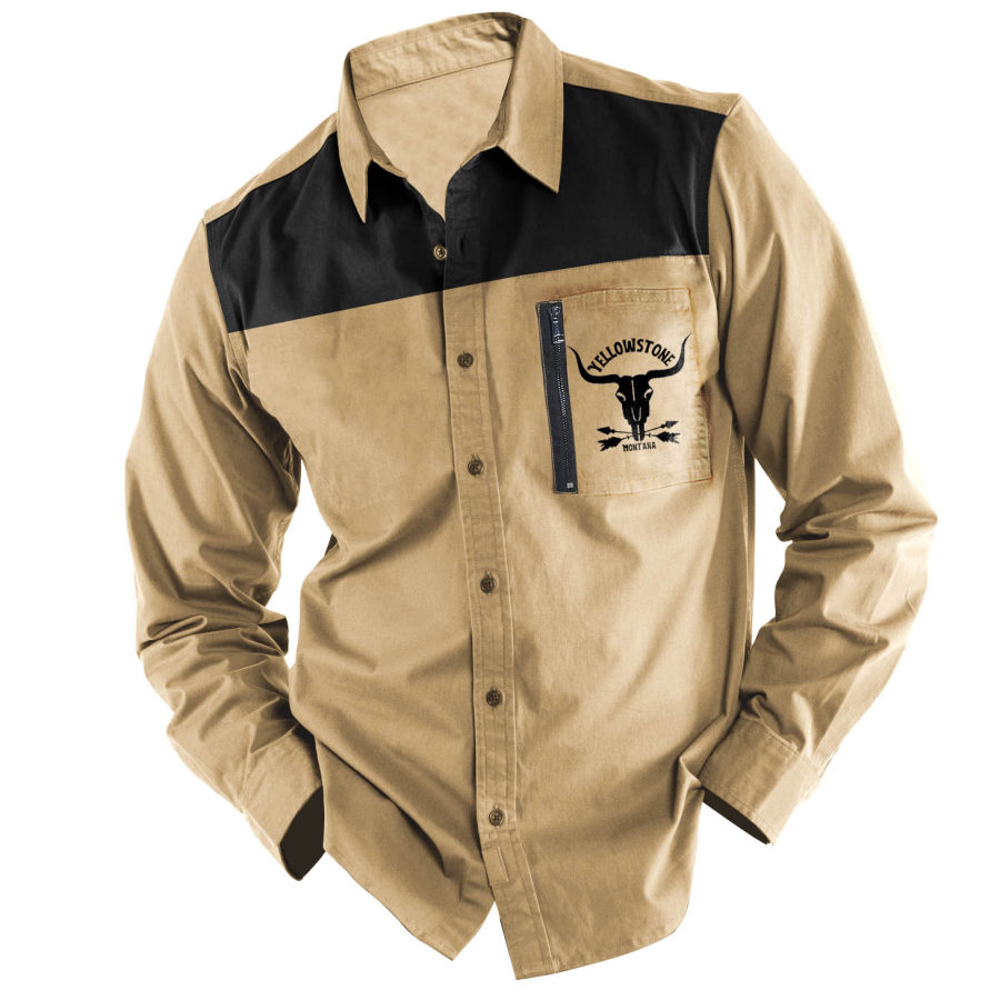 Мужская рубашка Йеллоустонский принт Винтаж Открытый карман с цветными блоками Длинный рукав Повседневные топы