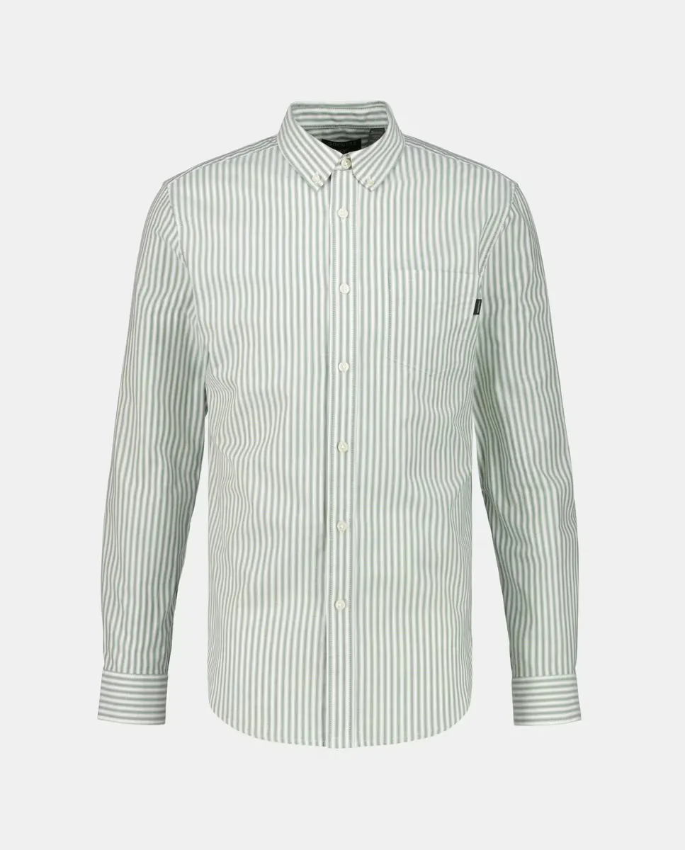 Мужская рубашка Оксфорд, зеленая полоска, приталенного кроя. Хлопчатобумажная ткань с содержанием эластана 4 %, пуговицы на шее и нагрудный карман с вышитым логотипом.