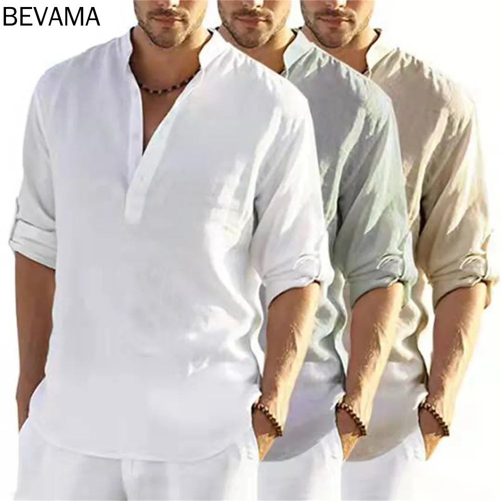 Мужская рубашка из 100% хлопка и льна, с длинным рукавом и воротником-стойкой