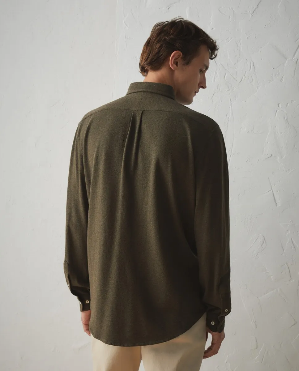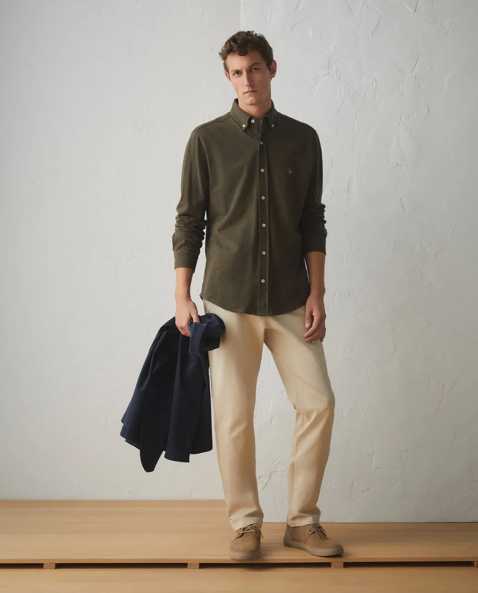 Мужская рубашка меланжевого пике с длинными рукавами. Воротник на пуговицах