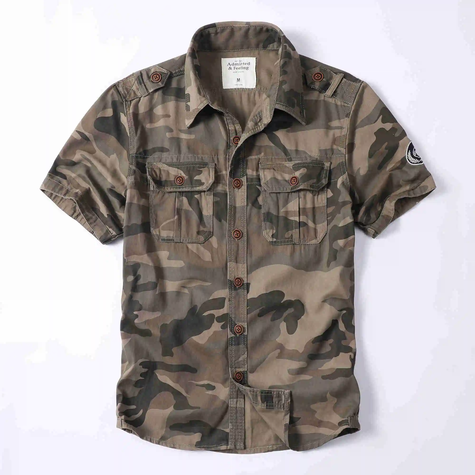 Мужская свободная рубашка с короткими рукавами, повседневная винтажная потертая хлопковая камуфляжная уличная рубашка с несколькими карманами, лето