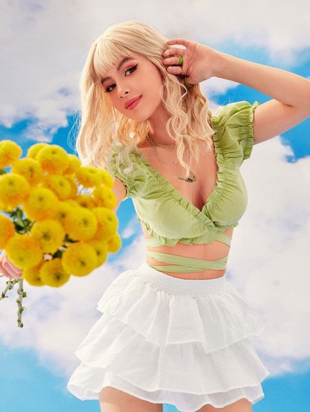 EHQAXIN Summer Ladies Shorts Set V-Neck Chiffon Lace-Up Top + Zipper Chiffon Button Short Style Two-Piece Fashion Set L-4XL