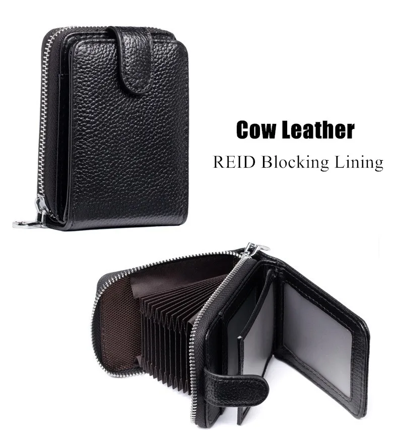 Мужская сумка для карт на молнии, черный кошелек из бычьей кожи, фото, функция защиты информации, многофункциональный складной кошелек