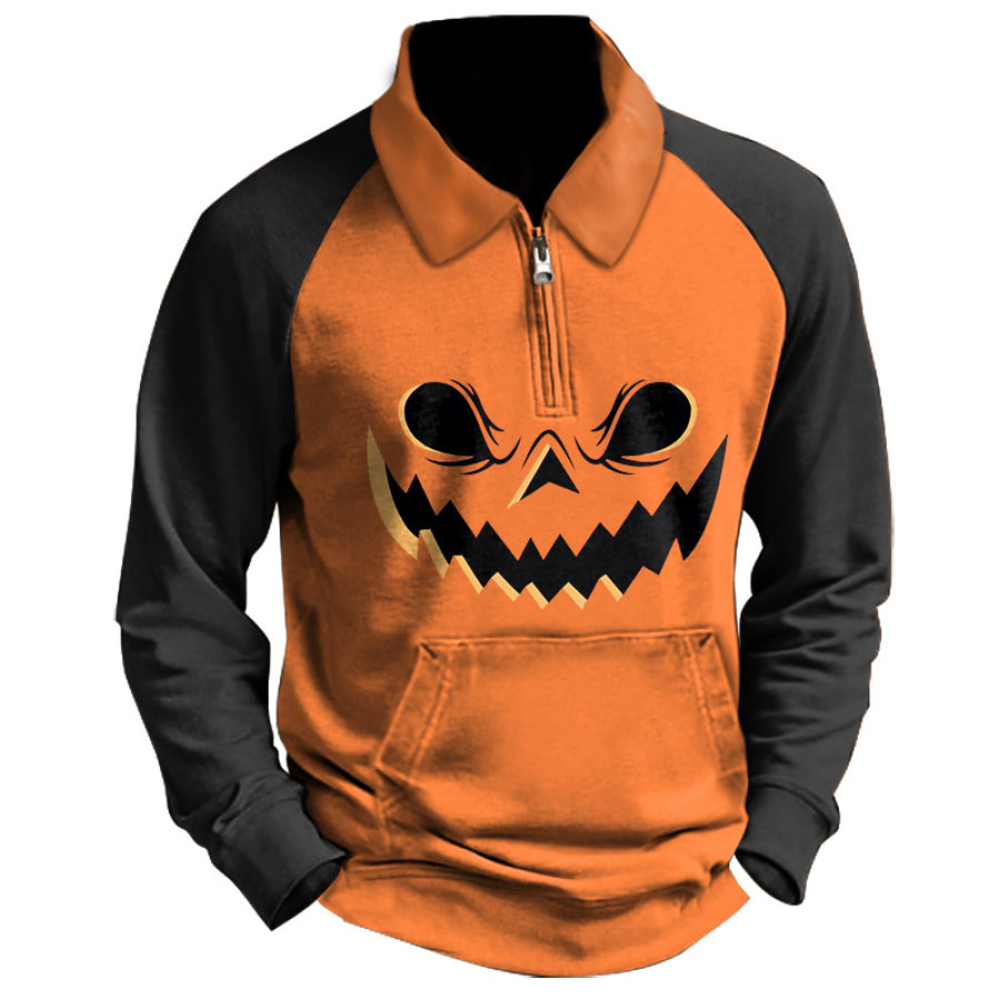 Мужская толстовка с молнией на четверть Винтаж Хэллоуин Тыквенное лицо Цветные блоки Повседневные топы