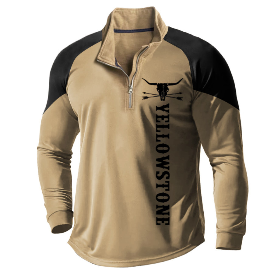Мужская футболка Йеллоустонский принт с молнией до четверти и воротником-стойкой с цветными блоками на открытом воздухе с длинным рукавом Повседневные топы