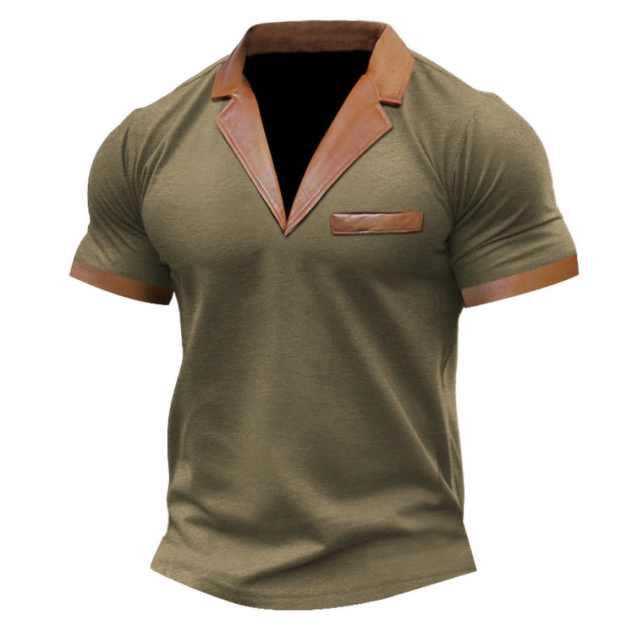 t-shirts,мужская футболка с кубинским воротником в стиле пэчворк кожаный карман контрастного цвета винтажный с коротким рукавом летние повседневные топы