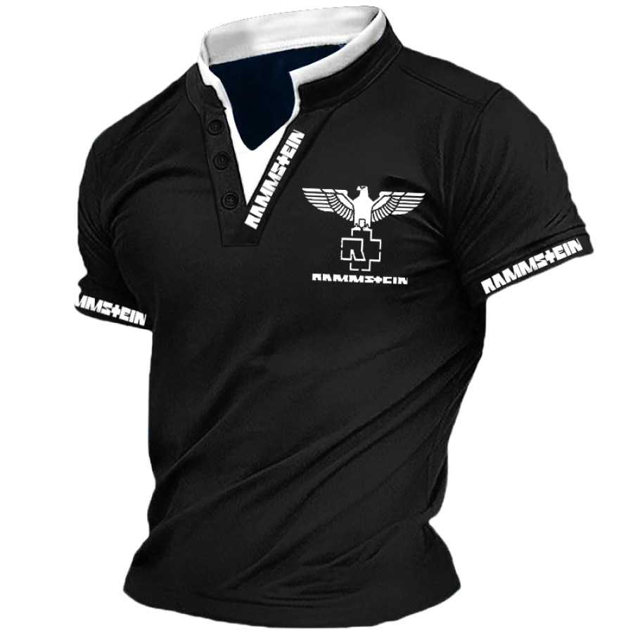Мужская футболка Rammstein с контрастными манжетами и буквенным принтом V-образным вырезом и воротником-стойкой
