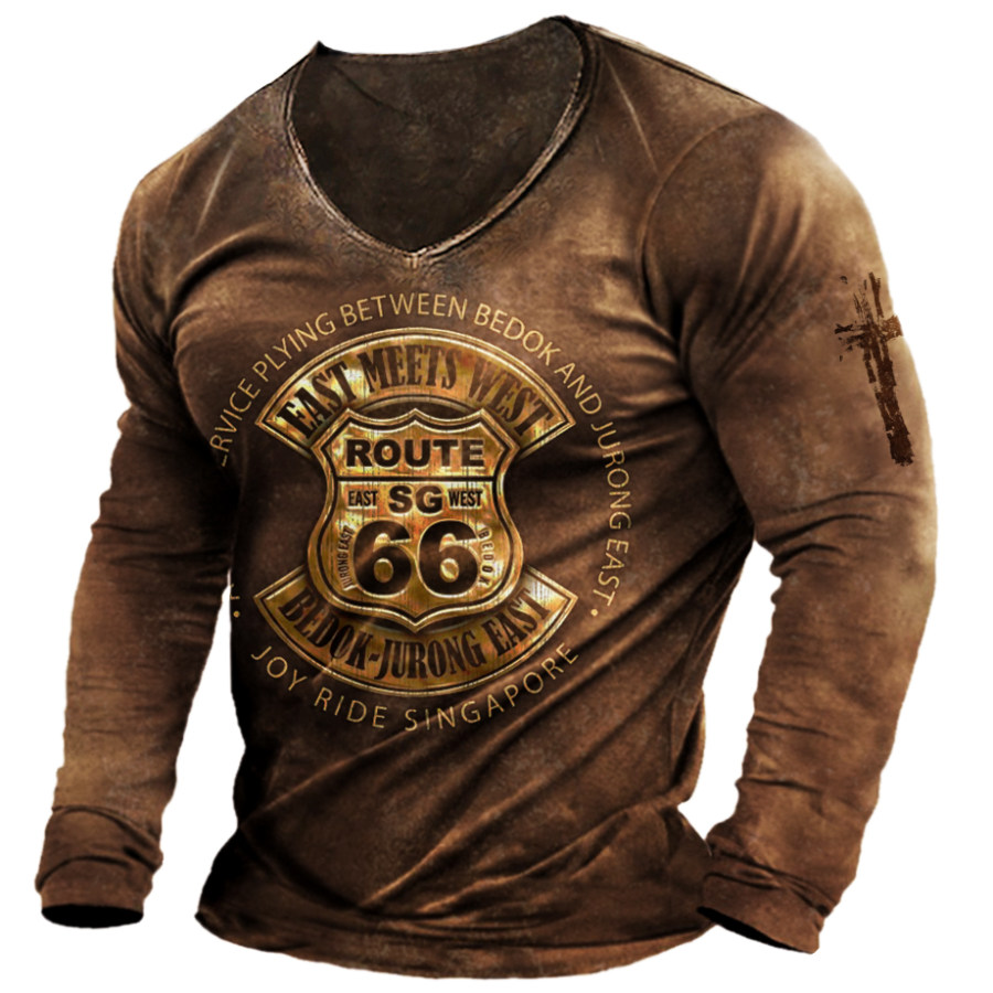 t-shirts,мужская футболка route 66 с v-образным вырезом и длинными рукавами с принтом в стиле ретро