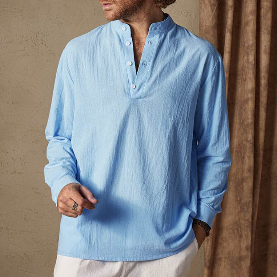 Мужская хлопково-льняная рубашка с воротником-хенли для пляжного отдыха и длинными рукавами повседневные повседневные топы