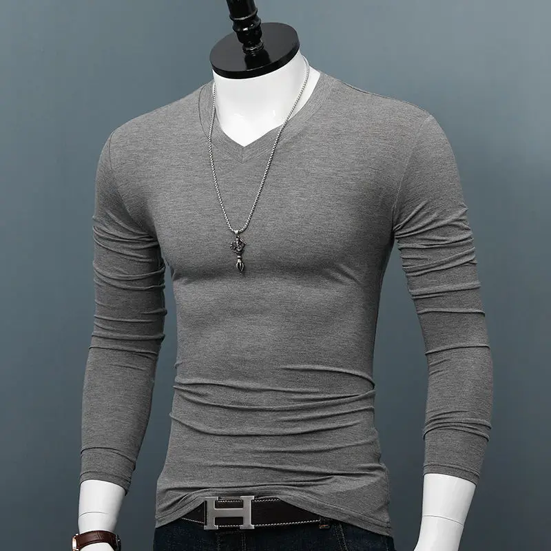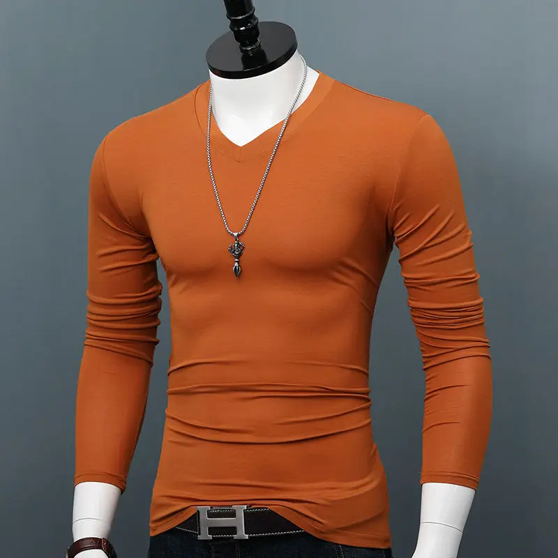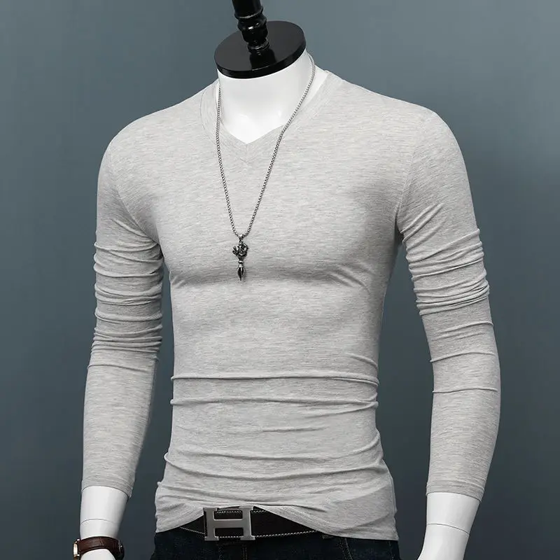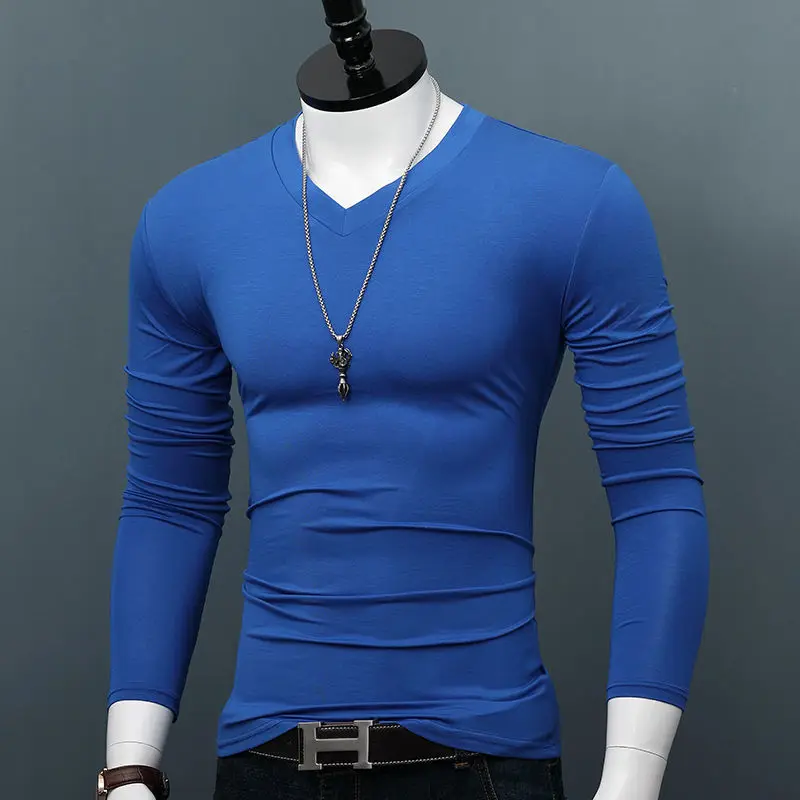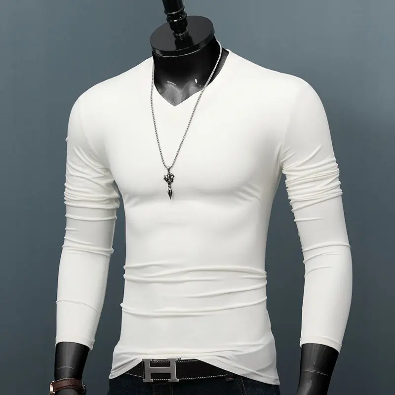 Мужская эластичная футболка с V-образным вырезом, длинным рукавом