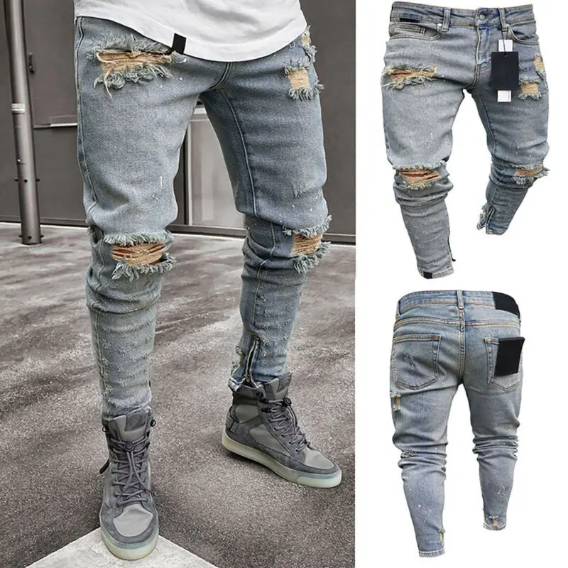 Мужские Стрейчевые рваные облегающие джинсы, потертые зауженные байкерские джинсовые длинные брюки