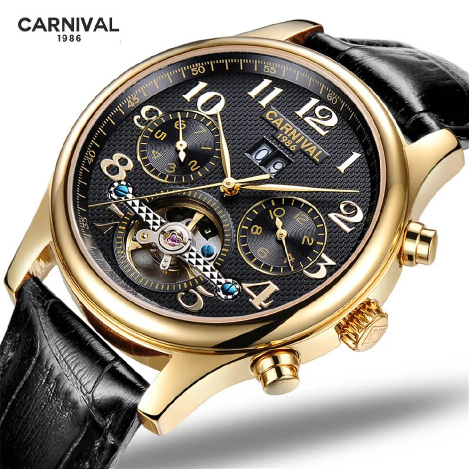 Мужские деловые модные часы CARNIVAL с турбийоном, Мужские автоматические механические часы с кожаным ремешком, часы с механизмом 25 рубий, нови...