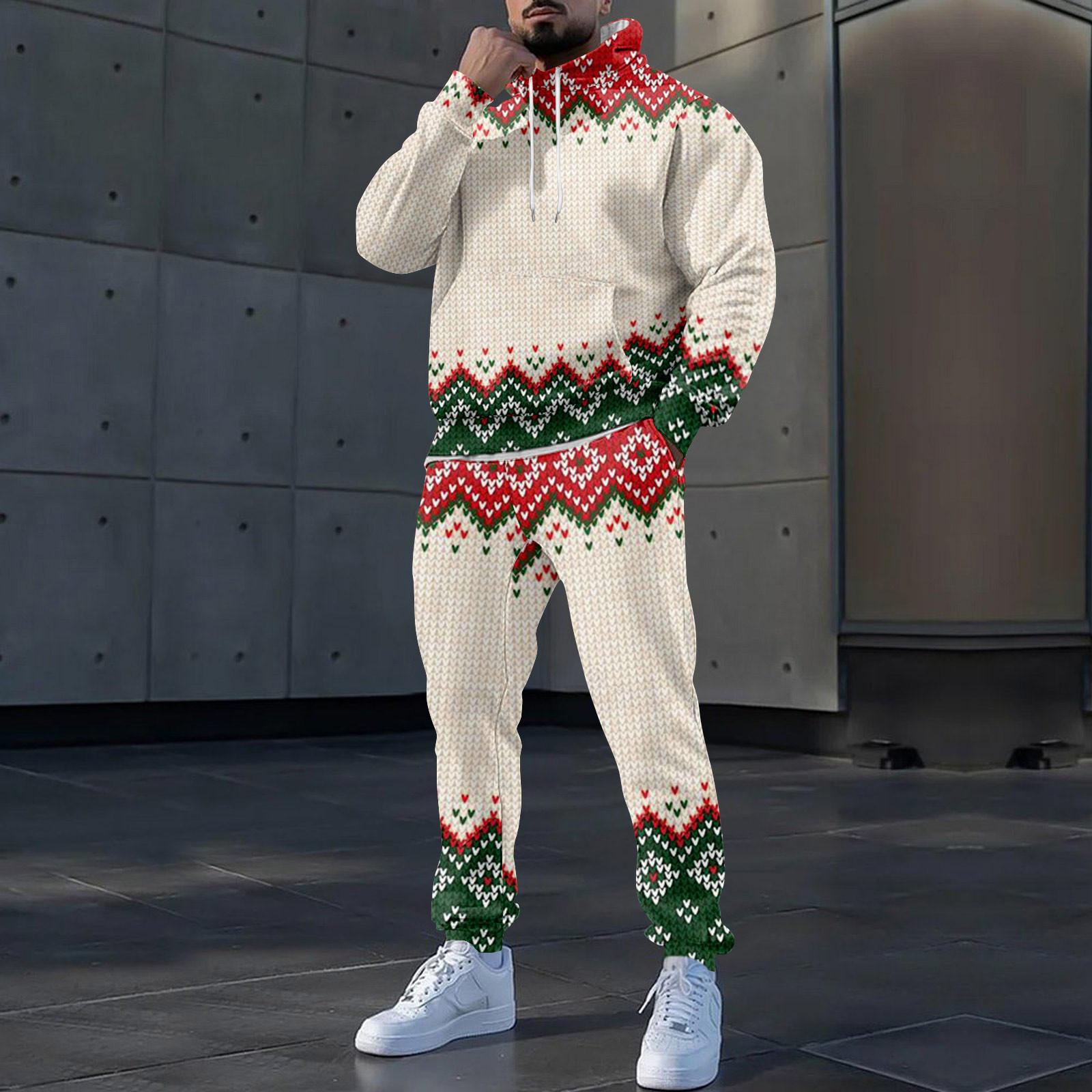 Мужские зимние рождественские принты с длинным рукавом толстовки с капюшоном толстовка брюки костюм XXXXXL бежевый